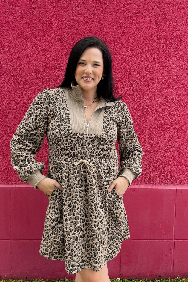 The Wild Night Dress combines bold style with comfort for your casual outings. Featuring long sleeves and a textured leopard fabric, this dress stands out while keeping you cozy. Practical side pockets add convenience, while the front zip allows easy wear and a flattering high neck completes the look. The adjustable drawstring waist lets you customize your fit, and solid contrast details add a chic touch, making this dress perfect for day-to-night wear with effortless flair.